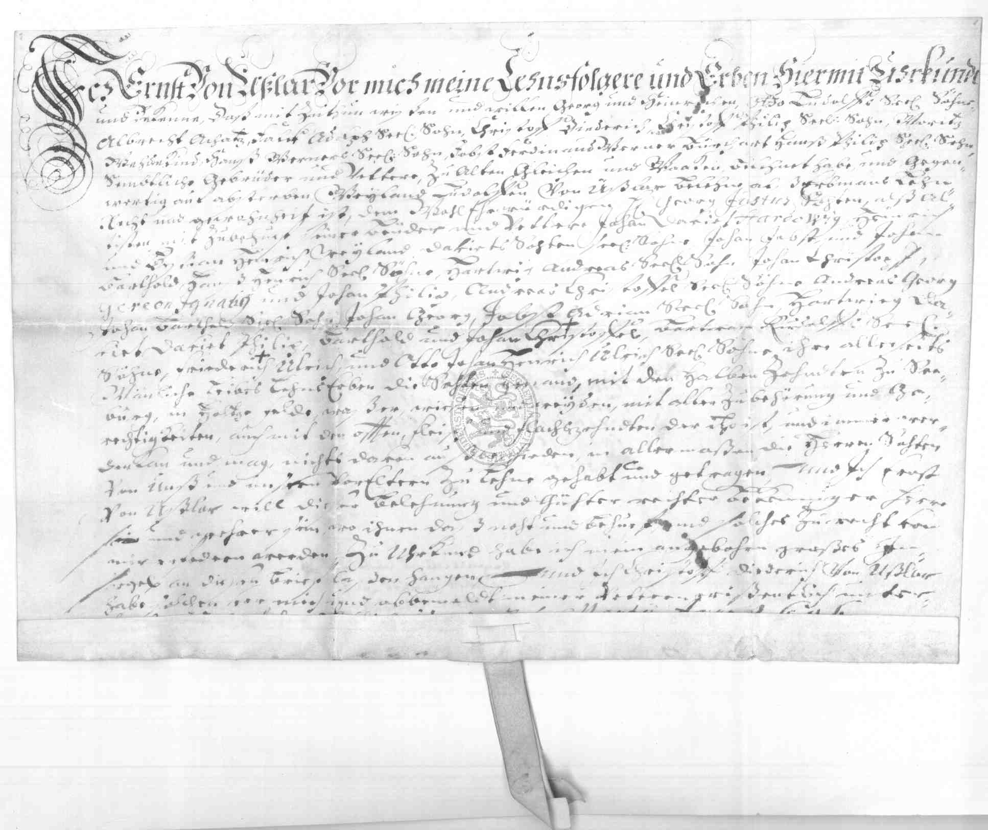 | Regest: | Ernst von Uslar belehnt für sich und seine Vettern zu Alten Gleichen und Waake (Namen) nach dem Absterben des Ludolff von Uslar den Wohlehrwürdigen Herrn Georg Justus Sothen als Ältesten zu Mitbehuf seiner Brüder und Vettern (Namen) mit dem halben Zehnten zu Seeburg etc. |