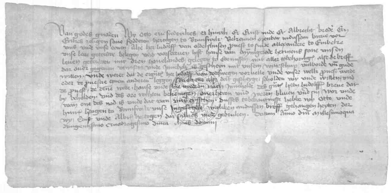 | Regest: | Die Herzöge Otto, Heinrich, Ernst und Albrecht von Braunschweig bekennen, daß Ludolf von Oldershusen, Probst von St. Alexander zu Einbeck, Hans von Minnigerode mit 3 Hufen Landes zu Edemissen belehnt hat |