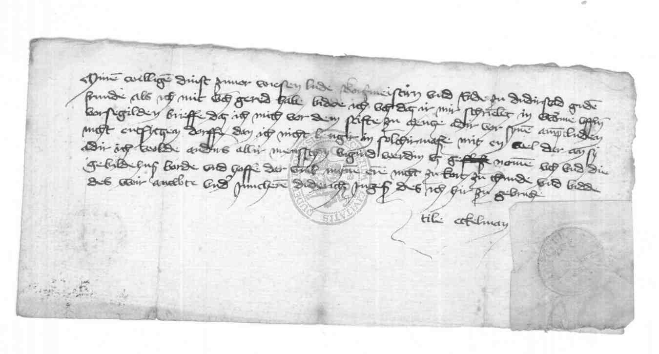 | Regest: | Tile Eckelman bittet den Rat, die Beschränckung seiner Freiheit aufzuheben. Für ihn siegelt ein Junker Diederich |