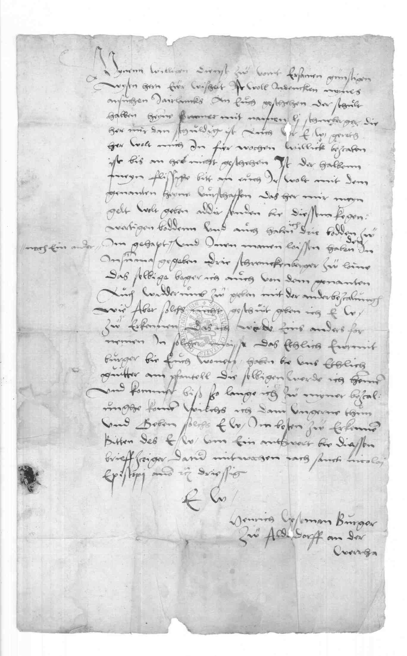 | Regest: | Heinrich Wesemann, Bürger zu Allendorf, schreibt an den Rat wegen einer Schuldforderung |
