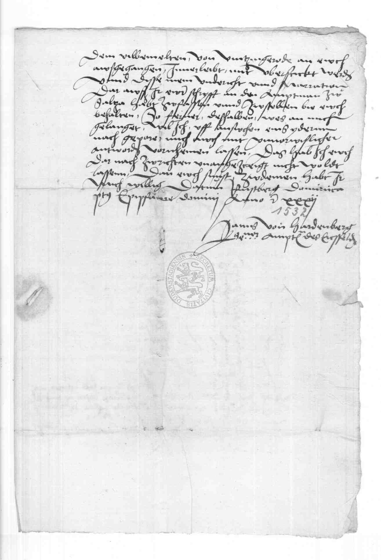 | Regest: | Hans von Hardenberg, Amtmann des Eichsfeldes, schreibt an den Rat zu Duderstadt anläßlich einer Klageschrift des herzogl. Sächsischen Amtmanns zu Salza über einen zu Duderstadt gefangen gehaltenen reisigen Knecht Georgs von Wintzingerode |