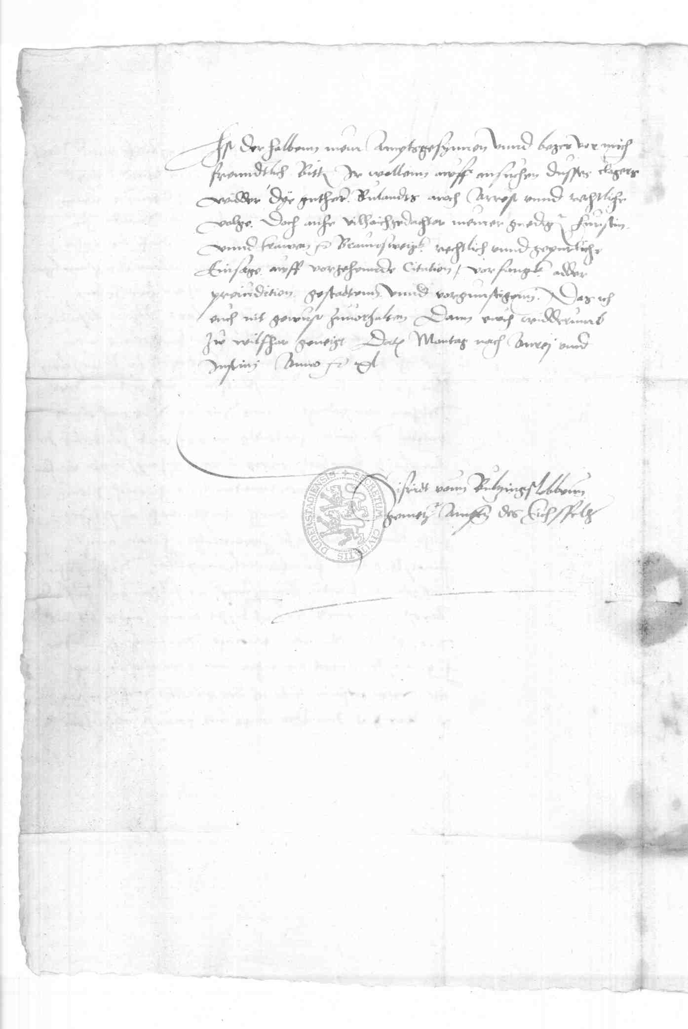 | Regest: | Siegfried von Bülzingslöwen, Amtmann des Eichsfeldes, schreibt an den Rat zu Duderstadt wegen einer Geldschuld, die der verstorbene Ruland Conradi gegen Siegfrieds Amtsverwandten Hans Schneider hatte etc., die Güter Rulands sollen mit Arrest belegt werden |