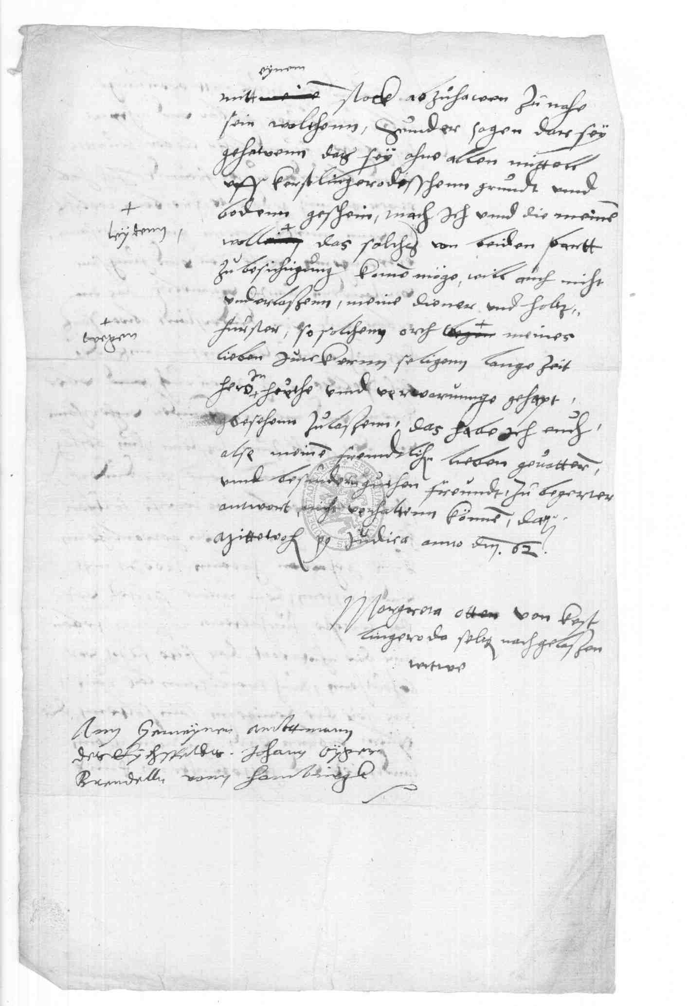 | Regest: | Margareta, Otten von Kerstlingerode selig nachgelassene Witwe, schreibt an den Amtmann des Eichsfeldes, Johann Oyger Brendell von Homburgk, und bestreitet eine Grenzverletzung seitens ihrer Diener, die nach Ansicht der Duderstädter den alten Landfrieden und hergebrachten Knick bei der Böningswarte verletzt haben sollen |