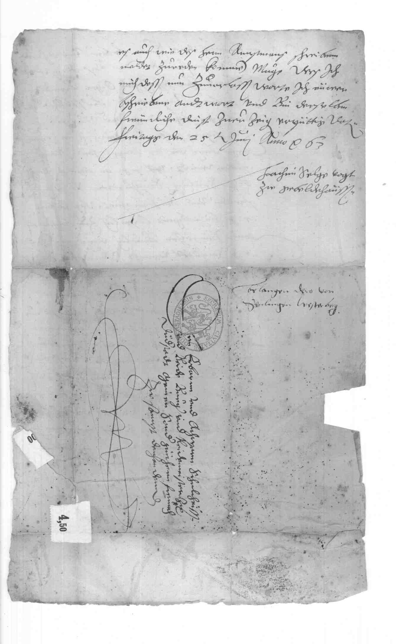 | Regest: | Joachim Selge, Vogt zu Gieboldehausen, schreibt an den Rat zu Duderstadt: Die Seulinger Einwohner haben sich bei Johann Oiger Brendel von Homburg, dem Amtmann des Eichsfeldes, wegen Eingriffe von Seiten der Landolfshäuser auf dem Westerberge beschwert. Selge bittet nun Duderstadt, ihm Hakenschützen samt einer Vertrauensperson nächster Tage nach Werxhausen oder Seulingen zu schicken, so daß er und seine Amtshilfe in Landolfshausen nachbarliche Pfändungen vornehmen kann |