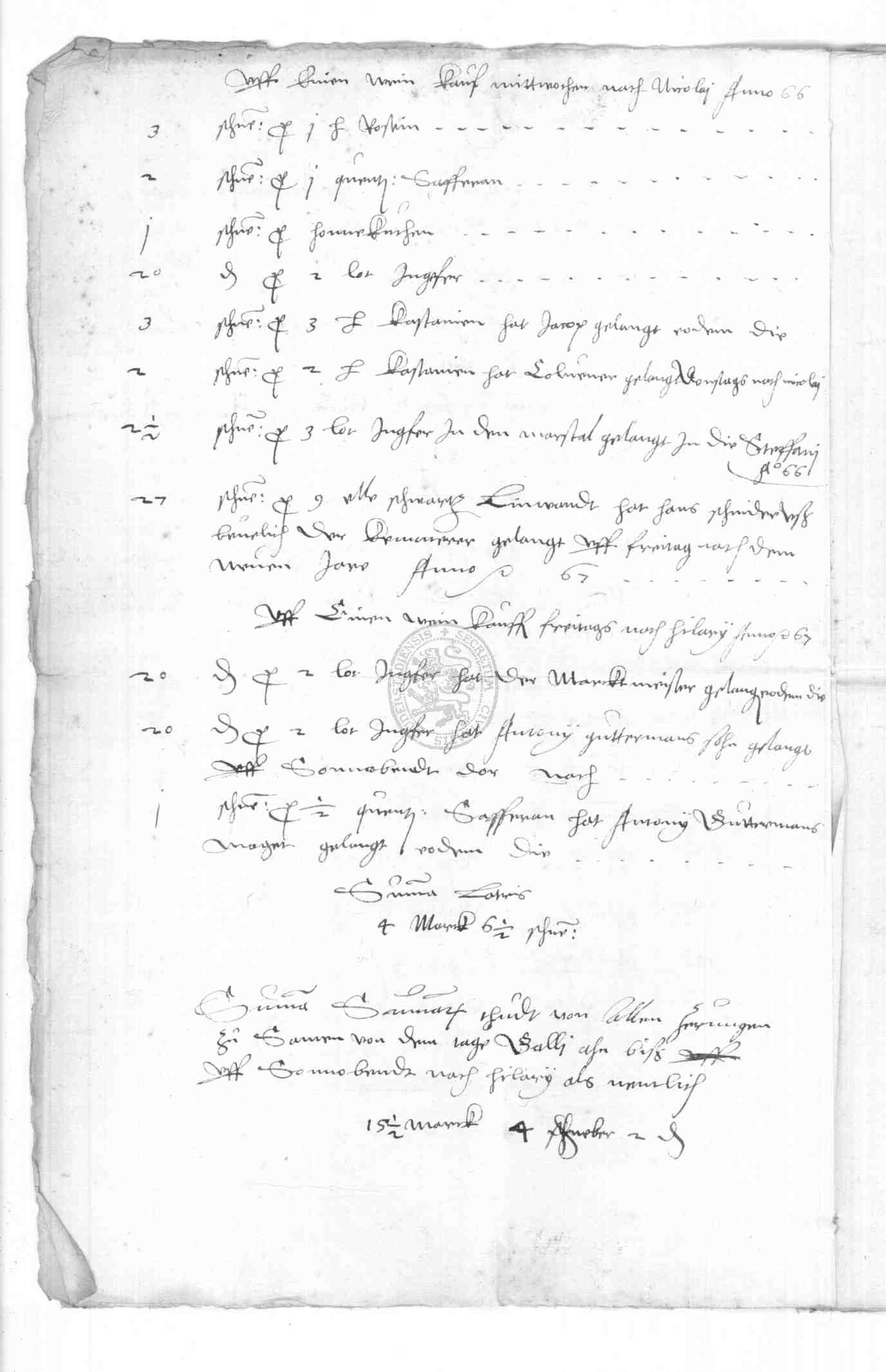 | Regest: | Rechnungen des Klaus Frone über Lieferungen aufs Rathaus, an die Schule, in Philipp Bonsacks Haus etc., desgl. 1579 und 1580. 1579 Rechnung des Klaus Frone über den auf der Frankfurter Herbstmesse von Bastian Schlecht aus Straßburg gekauften Branntwein, Ingwer, Saffran und Zinnbecken. (die letzteren auf dem Michaelismarkte zu Leipzig gekauft). Alles zusammen kostete 312 rt 1 fgr. 4 1/2 fd |