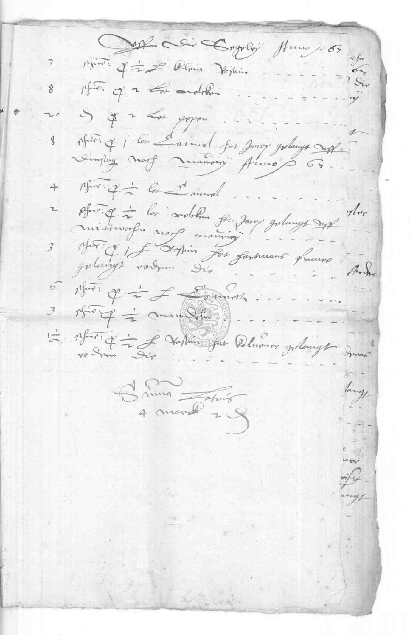 | Regest: | Rechnungen des Klaus Frone über Lieferungen aufs Rathaus, an die Schule, in Philipp Bonsacks Haus etc., desgl. 1579 und 1580. 1579 Rechnung des Klaus Frone über den auf der Frankfurter Herbstmesse von Bastian Schlecht aus Straßburg gekauften Branntwein, Ingwer, Saffran und Zinnbecken. (die letzteren auf dem Michaelismarkte zu Leipzig gekauft). Alles zusammen kostete 312 rt 1 fgr. 4 1/2 fd |