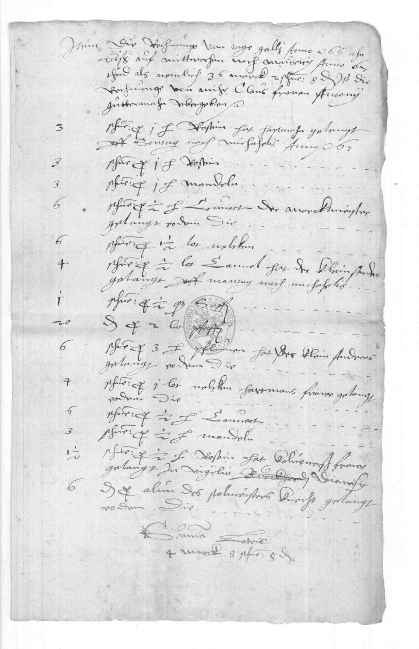 | Regest: | Rechnungen des Klaus Frone über Lieferungen aufs Rathaus, an die Schule, in Philipp Bonsacks Haus etc., desgl. 1579 und 1580. 1579 Rechnung des Klaus Frone über den auf der Frankfurter Herbstmesse von Bastian Schlecht aus Straßburg gekauften Branntwein, Ingwer, Saffran und Zinnbecken. (die letzteren auf dem Michaelismarkte zu Leipzig gekauft). Alles zusammen kostete 312 rt 1 fgr. 4 1/2 fd |