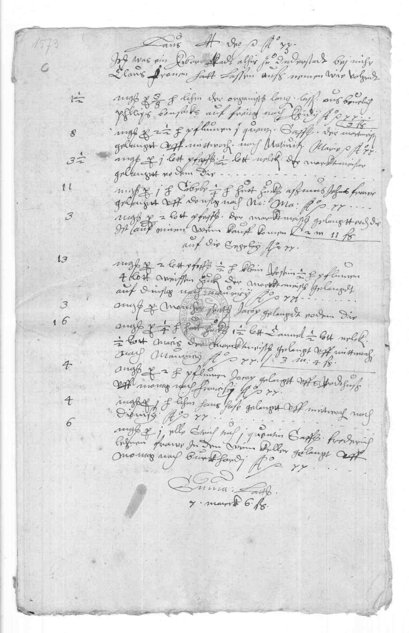 | Regest: | Rechnungen des Klaus Frone über Lieferungen aufs Rathaus, an die Schule, in Philipp Bonsacks Haus etc., desgl. 1579 und 1580. 1579 Rechnung des Klaus Frone über den auf der Frankfurter Herbstmesse von Bastian Schlecht aus Straßburg gekauften Branntwein, Ingwer, Saffran und Zinnbecken. (die letzteren auf dem Michaelismarkte zu Leipzig gekauft). Alles zusammen kostete 312 rt 1 fgr. 4 1/2 fd |