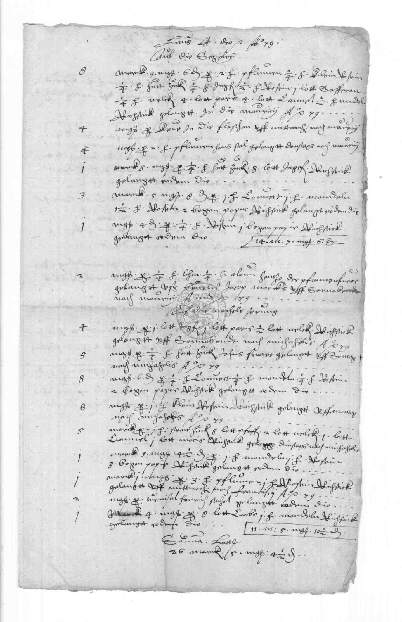 | Regest: | Rechnungen des Klaus Frone über Lieferungen aufs Rathaus, an die Schule, in Philipp Bonsacks Haus etc., desgl. 1579 und 1580. 1579 Rechnung des Klaus Frone über den auf der Frankfurter Herbstmesse von Bastian Schlecht aus Straßburg gekauften Branntwein, Ingwer, Saffran und Zinnbecken. (die letzteren auf dem Michaelismarkte zu Leipzig gekauft). Alles zusammen kostete 312 rt 1 fgr. 4 1/2 fd |