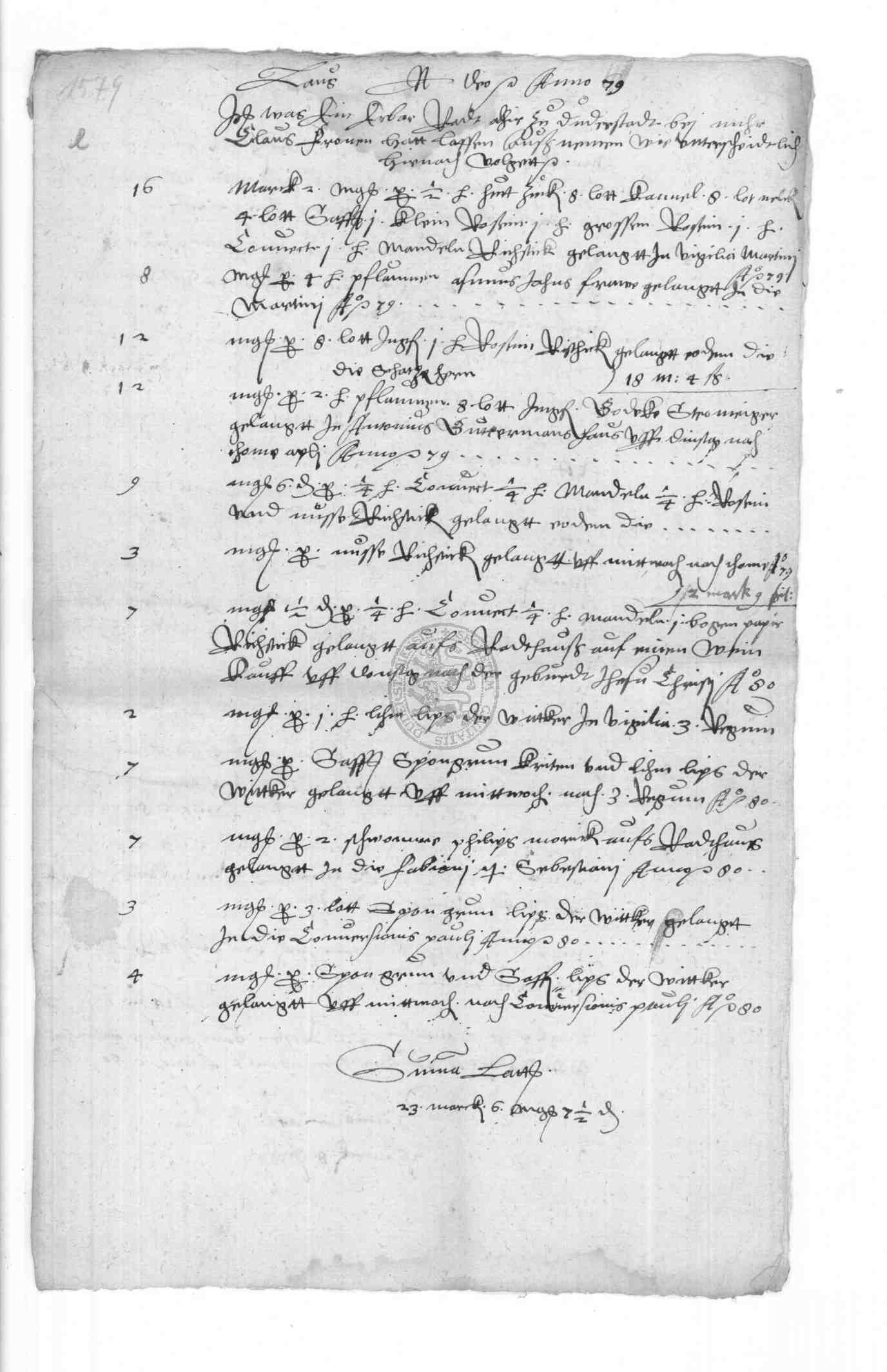 | Regest: | Rechnungen des Klaus Frone über Lieferungen aufs Rathaus, an die Schule, in Philipp Bonsacks Haus etc., desgl. 1579 und 1580. 1579 Rechnung des Klaus Frone über den auf der Frankfurter Herbstmesse von Bastian Schlecht aus Straßburg gekauften Branntwein, Ingwer, Saffran und Zinnbecken. (die letzteren auf dem Michaelismarkte zu Leipzig gekauft). Alles zusammen kostete 312 rt 1 fgr. 4 1/2 fd |