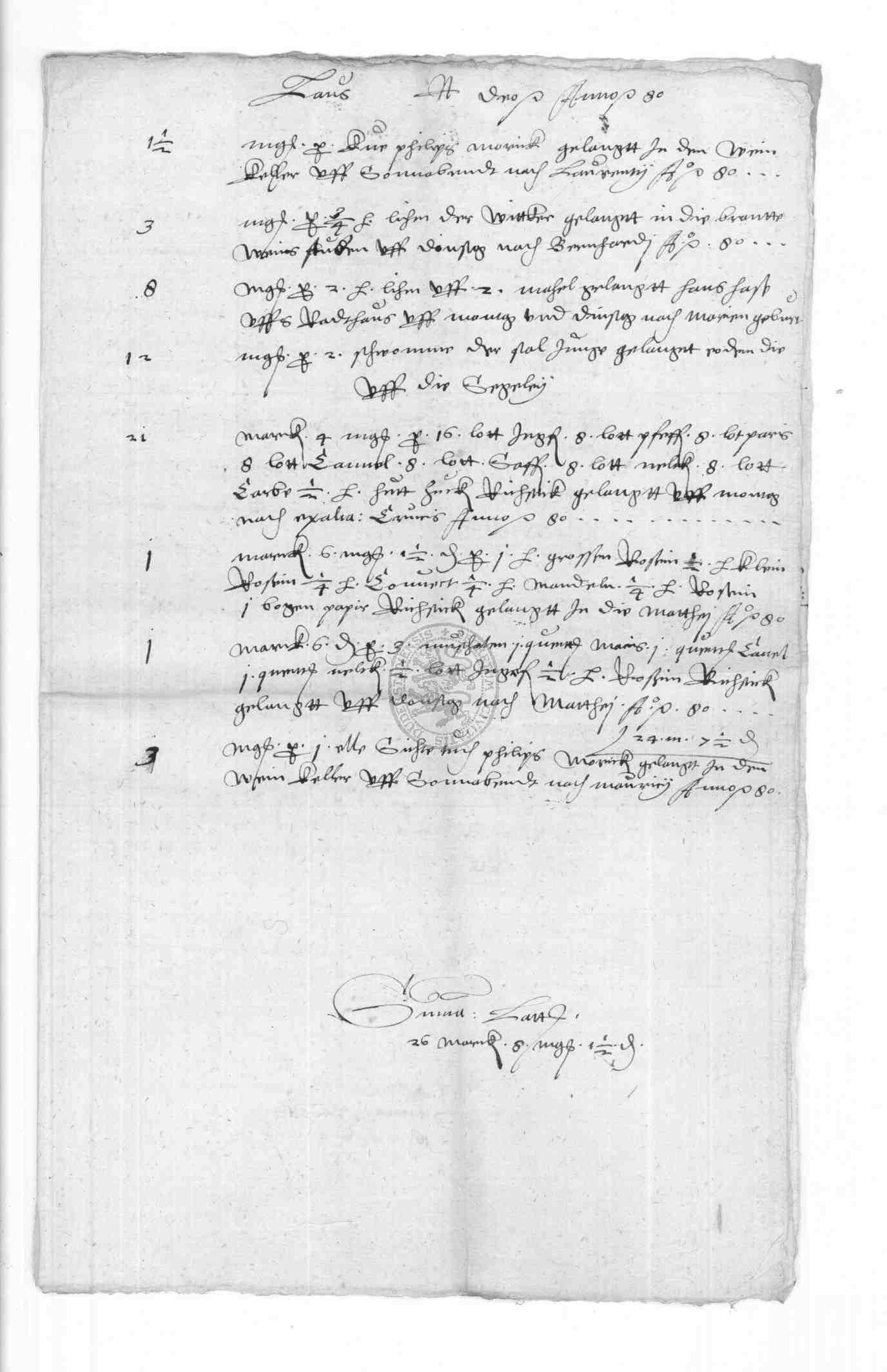 | Regest: | Rechnungen des Klaus Frone über Lieferungen aufs Rathaus, an die Schule, in Philipp Bonsacks Haus etc., desgl. 1579 und 1580. 1579 Rechnung des Klaus Frone über den auf der Frankfurter Herbstmesse von Bastian Schlecht aus Straßburg gekauften Branntwein, Ingwer, Saffran und Zinnbecken. (die letzteren auf dem Michaelismarkte zu Leipzig gekauft). Alles zusammen kostete 312 rt 1 fgr. 4 1/2 fd |