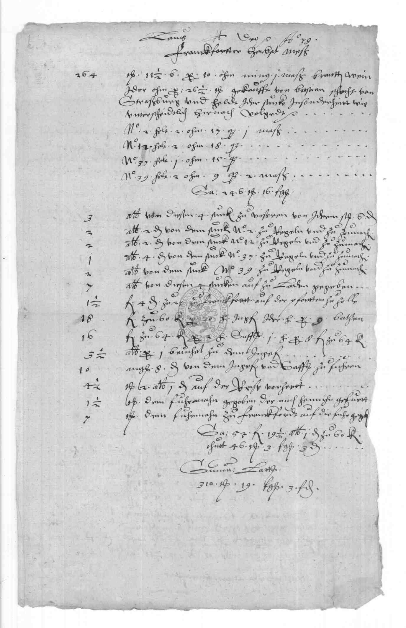 | Regest: | Rechnungen des Klaus Frone über Lieferungen aufs Rathaus, an die Schule, in Philipp Bonsacks Haus etc., desgl. 1579 und 1580. 1579 Rechnung des Klaus Frone über den auf der Frankfurter Herbstmesse von Bastian Schlecht aus Straßburg gekauften Branntwein, Ingwer, Saffran und Zinnbecken. (die letzteren auf dem Michaelismarkte zu Leipzig gekauft). Alles zusammen kostete 312 rt 1 fgr. 4 1/2 fd |