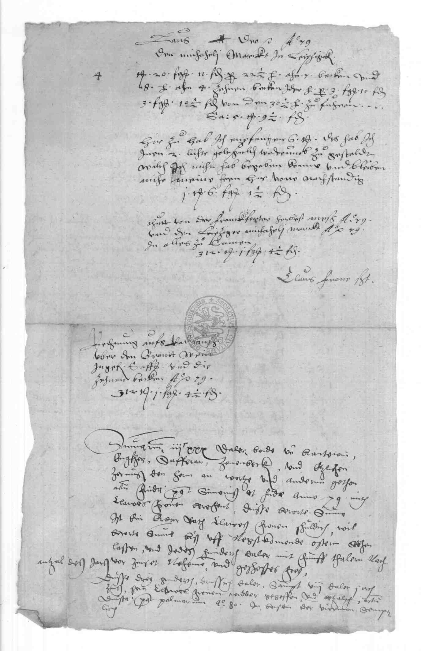 | Regest: | Rechnungen des Klaus Frone über Lieferungen aufs Rathaus, an die Schule, in Philipp Bonsacks Haus etc., desgl. 1579 und 1580. 1579 Rechnung des Klaus Frone über den auf der Frankfurter Herbstmesse von Bastian Schlecht aus Straßburg gekauften Branntwein, Ingwer, Saffran und Zinnbecken. (die letzteren auf dem Michaelismarkte zu Leipzig gekauft). Alles zusammen kostete 312 rt 1 fgr. 4 1/2 fd |